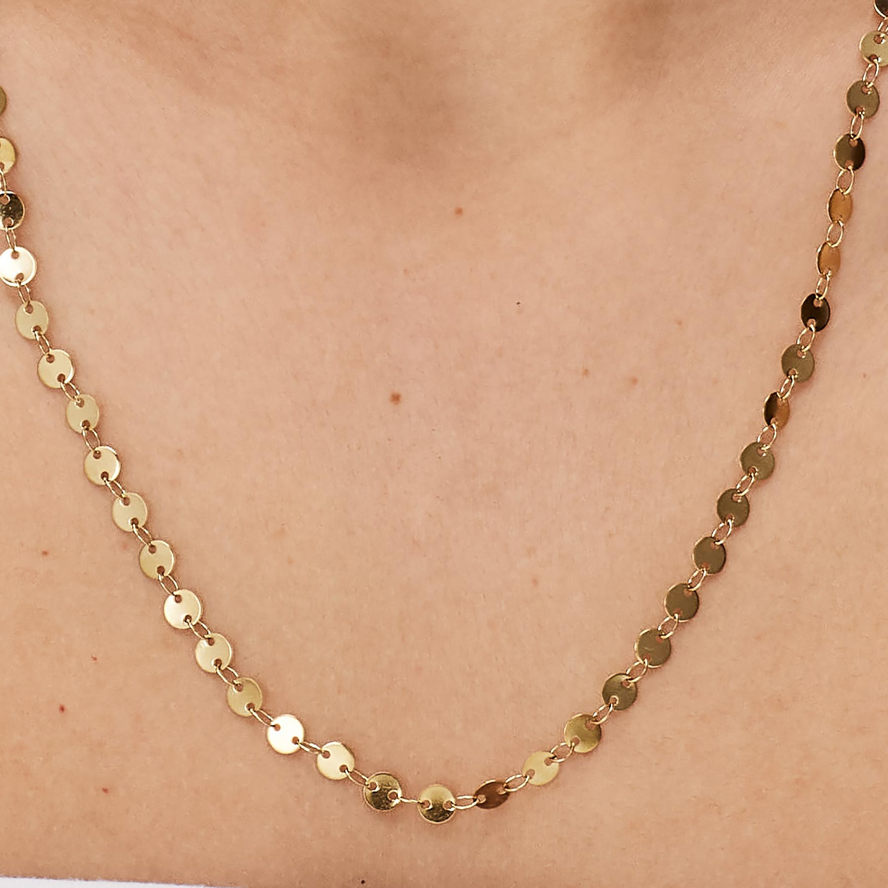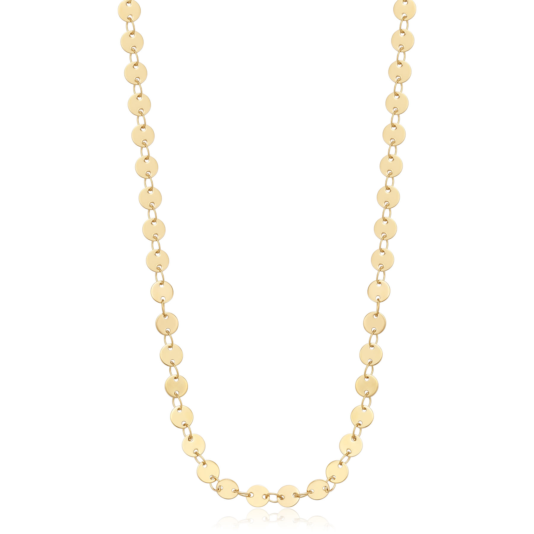 Collana lunga in acciaio 316L e finitura pvd oro 14k con catena a dischetti.