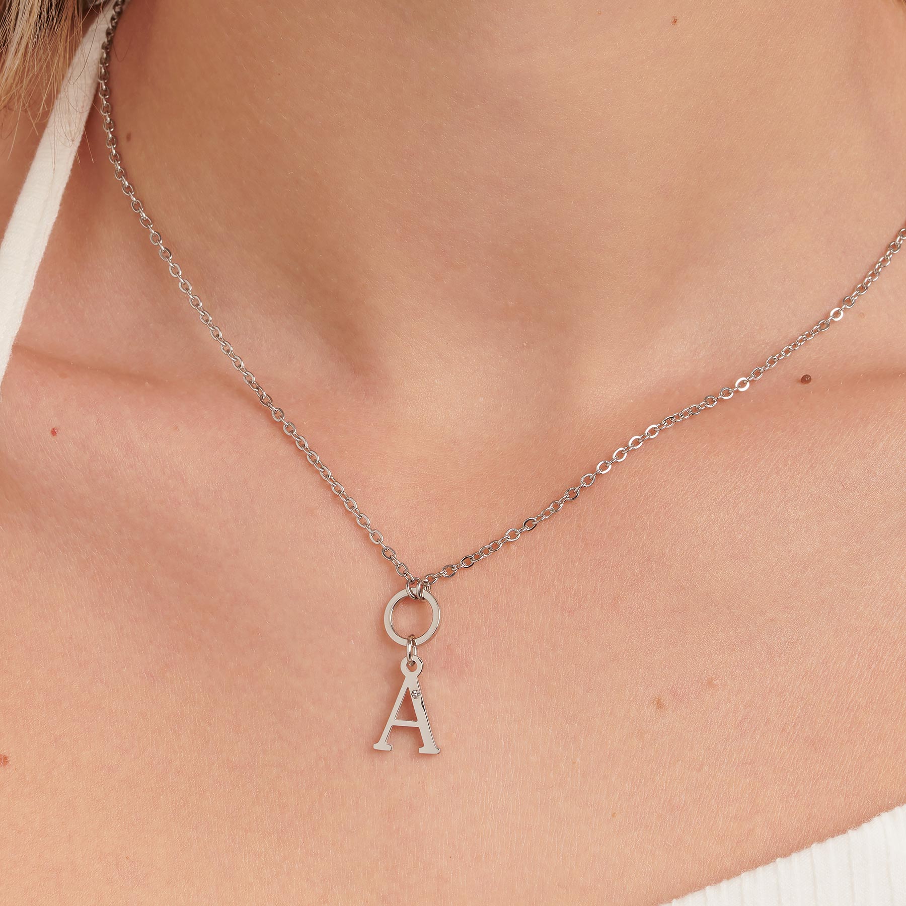 Collana girocollo in acciaio 316L con pendente a forma di lettera R e cristallo.